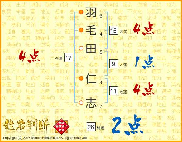 羽(6画)毛(4画)田(5画) 仁(4画)志(7画)