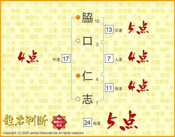 生活面を象徴する運勢です。外部から受ける影響力を表し、結婚運、家庭運や職場、環境への順応性を表します。総運から人運を引いた画数。姓や名が1文字の場合を除く。