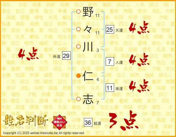 野(11画)々(11画)川(3画) 仁(4画)志(7画)