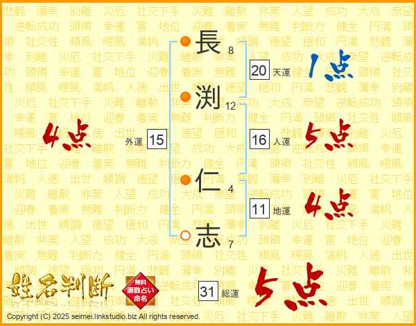 あなたの人生を表す1番重要な運勢です。生涯を通じて影響する総合運となり、主に50歳以降の晩年期に影響を及ぼします。苗字と名前の合計画数。