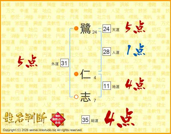 あなたの人生を表す1番重要な運勢です。生涯を通じて影響する総合運となり、主に50歳以降の晩年期に影響を及ぼします。苗字と名前の合計画数。