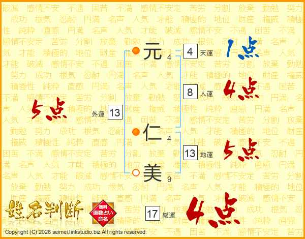 元(4画) 仁(4画)美(9画)