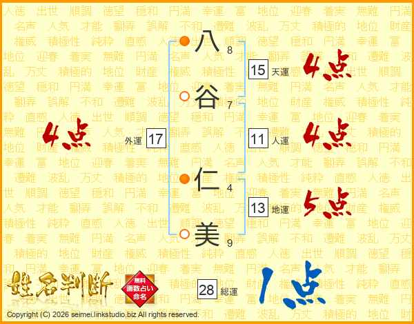 八(8画)谷(7画) 仁(4画)美(9画)
