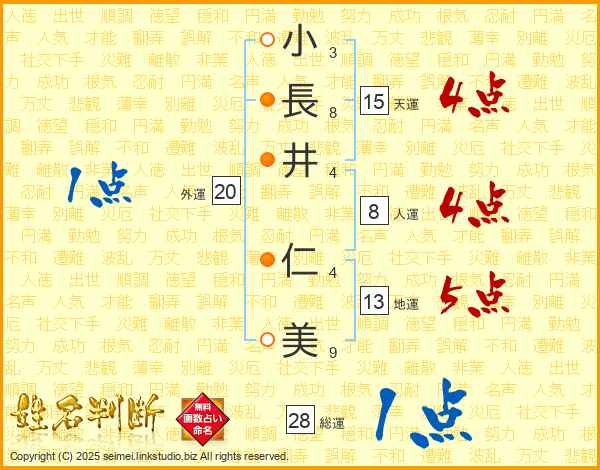 小(3画)長(8画)井(4画) 仁(4画)美(9画)