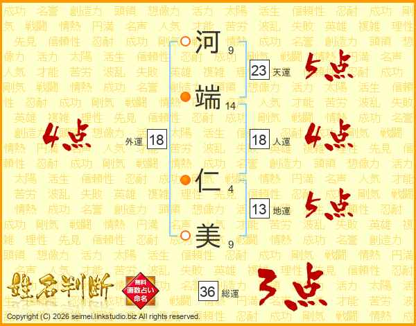 河(9画)端(14画) 仁(4画)美(9画)