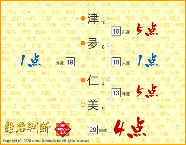 津夛仁美さんの総運は29画の4点!