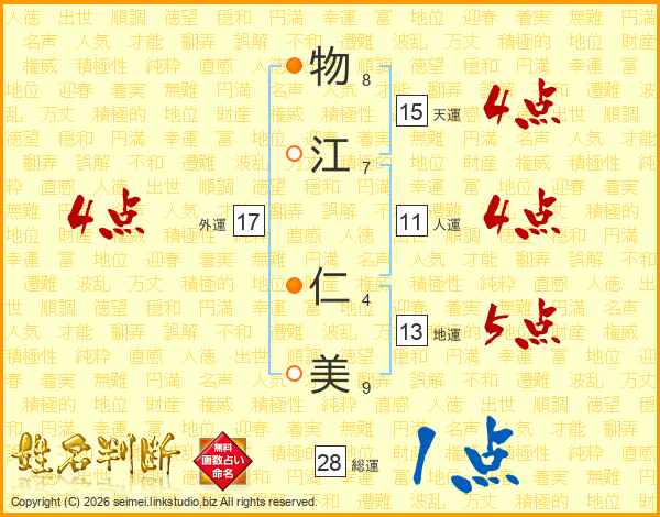 生活面を象徴する運勢です。外部から受ける影響力を表し、結婚運、家庭運や職場、環境への順応性を表します。総運から人運を引いた画数。姓や名が1文字の場合を除く。