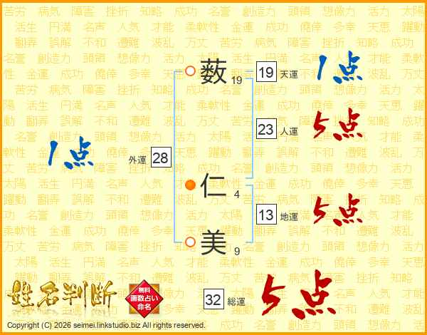 生活面を象徴する運勢です。外部から受ける影響力を表し、結婚運、家庭運や職場、環境への順応性を表します。総運から人運を引いた画数。姓や名が1文字の場合を除く。
