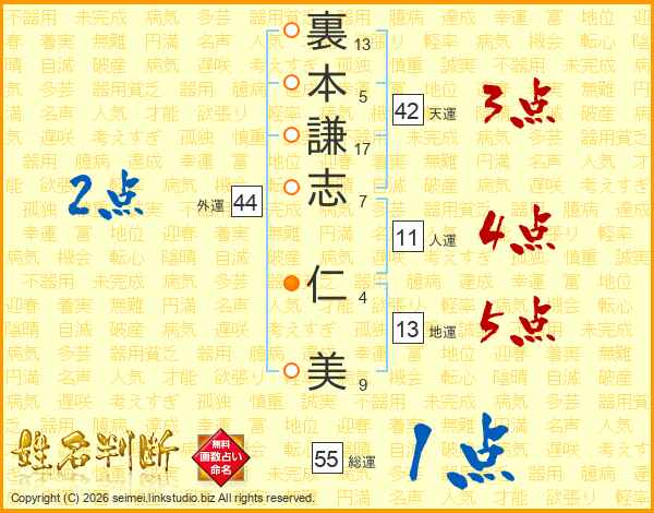 裏(13画)本(5画)謙(17画)志(7画) 仁(4画)美(9画)