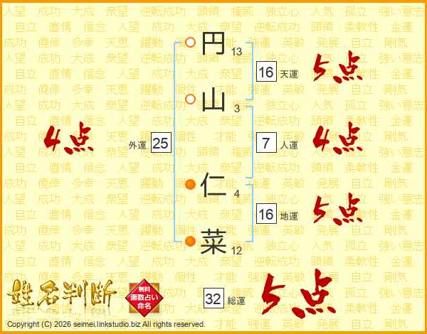 あなたの人生を表す1番重要な運勢です。生涯を通じて影響する総合運となり、主に50歳以降の晩年期に影響を及ぼします。苗字と名前の合計画数。