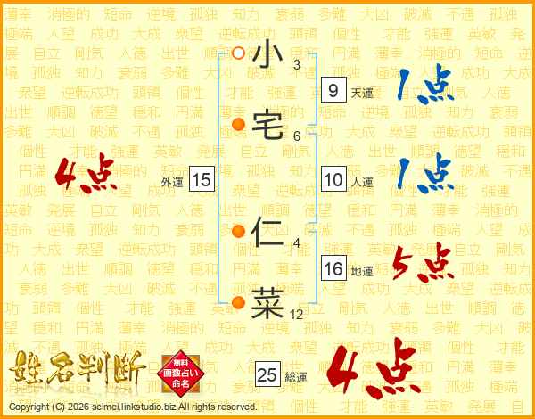 小宅仁菜さんの総運は25画の4点!