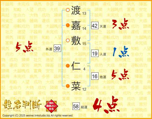 渡(13画)嘉(14画)敷(15画) 仁(4画)菜(12画)