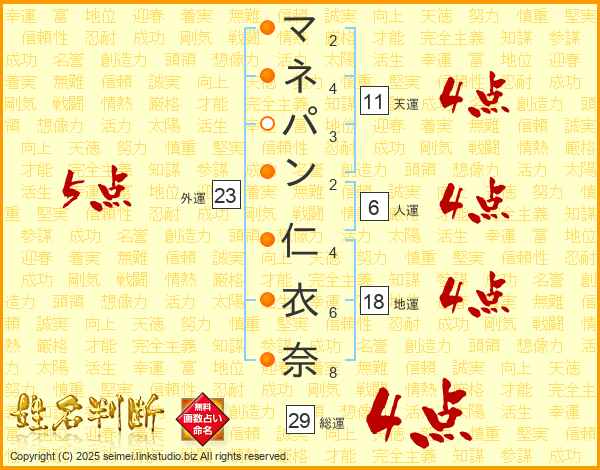 マ(2画)ネ(4画)パ(3画)ン(2画) 仁(4画)衣(6画)奈(8画)