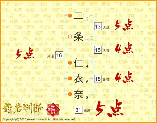 二条仁衣奈さんの総運は31画の5点!