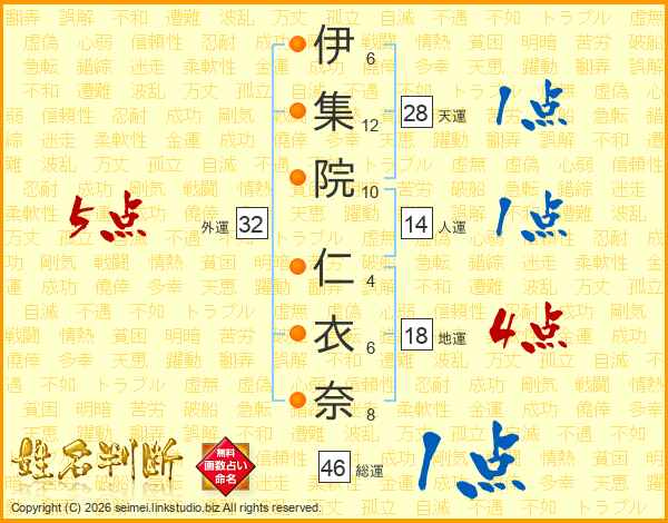 伊(6画)集(12画)院(10画) 仁(4画)衣(6画)奈(8画)