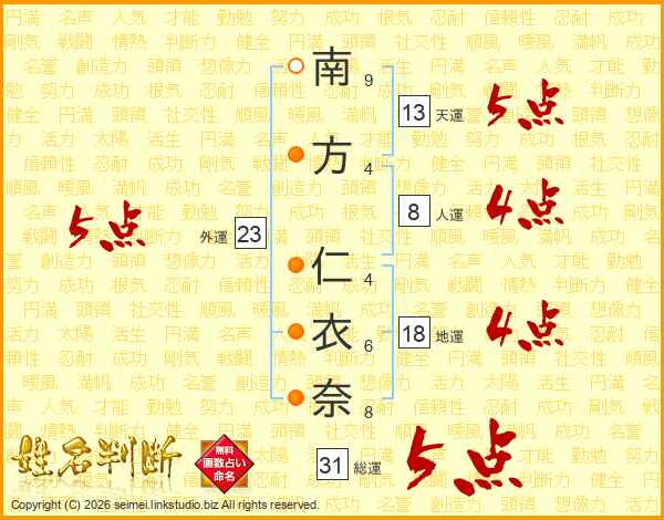 南(9画)方(4画) 仁(4画)衣(6画)奈(8画)