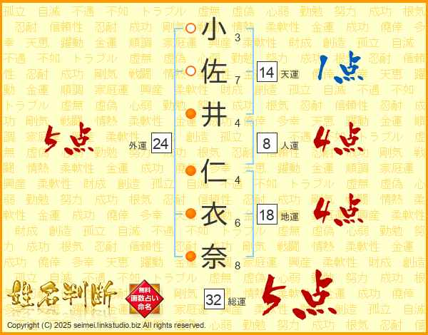 小(3画)佐(7画)井(4画) 仁(4画)衣(6画)奈(8画)