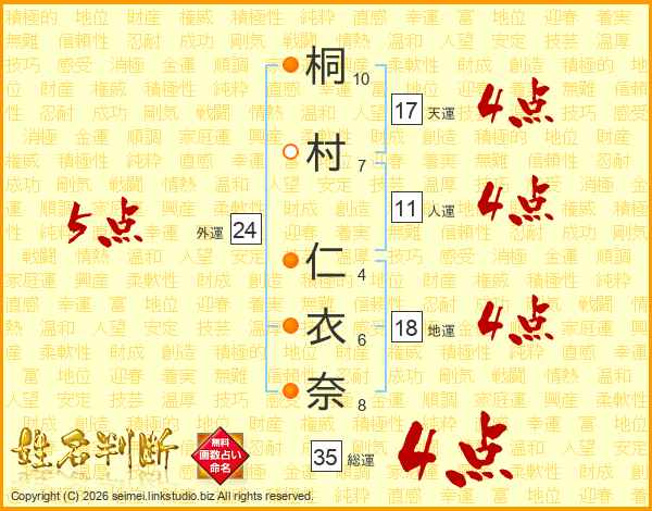 桐(10画)村(7画) 仁(4画)衣(6画)奈(8画)