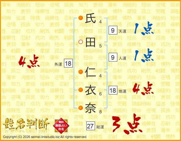 氏(4画)田(5画) 仁(4画)衣(6画)奈(8画)
