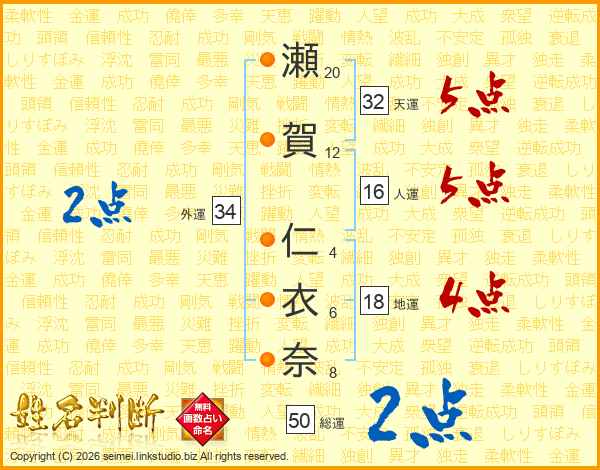 瀬(20画)賀(12画) 仁(4画)衣(6画)奈(8画)