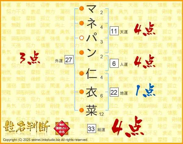 マ(2画)ネ(4画)パ(3画)ン(2画) 仁(4画)衣(6画)菜(12画)