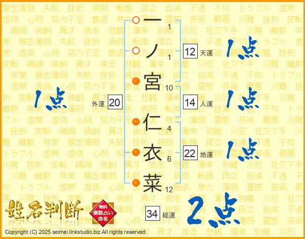 一ノ宮仁衣菜さんの総運は34画の2点!