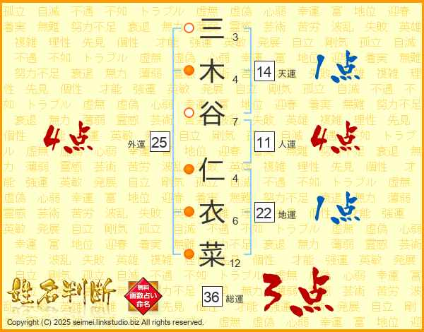 三(3画)木(4画)谷(7画) 仁(4画)衣(6画)菜(12画)