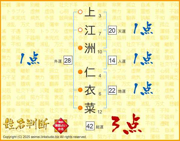 生活面を象徴する運勢です。外部から受ける影響力を表し、結婚運、家庭運や職場、環境への順応性を表します。総運から人運を引いた画数。姓や名が1文字の場合を除く。