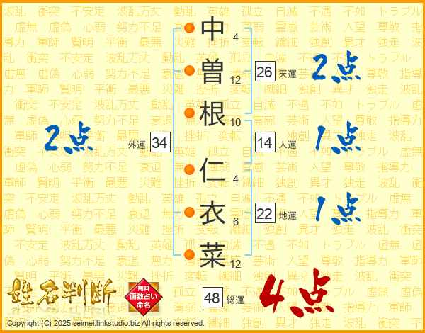 中(4画)曽(12画)根(10画) 仁(4画)衣(6画)菜(12画)