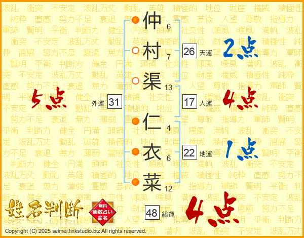仲村渠仁衣菜さんの総運は48画の4点!