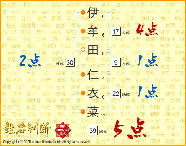 伊(6画)牟(6画)田(5画) 仁(4画)衣(6画)菜(12画)