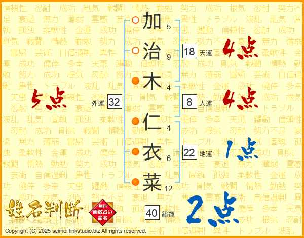 加(5画)治(9画)木(4画) 仁(4画)衣(6画)菜(12画)