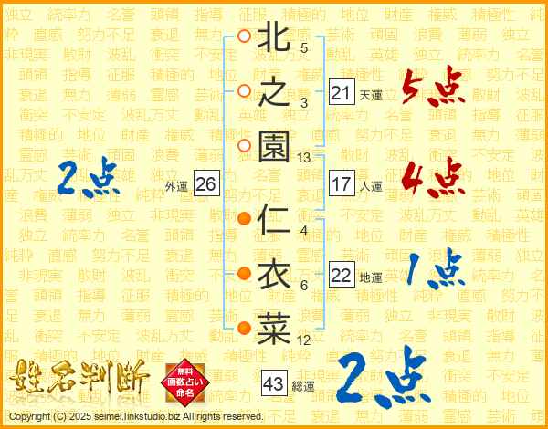 北(5画)之(3画)園(13画) 仁(4画)衣(6画)菜(12画)
