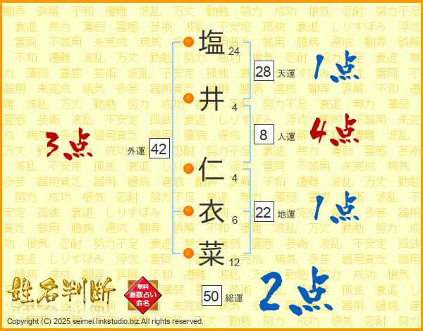 塩(24画)井(4画) 仁(4画)衣(6画)菜(12画)