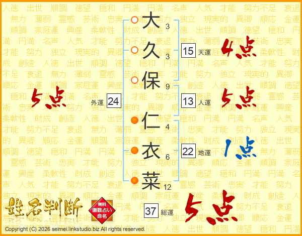 大(3画)久(3画)保(9画) 仁(4画)衣(6画)菜(12画)