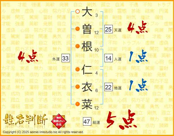 大(3画)曽(12画)根(10画) 仁(4画)衣(6画)菜(12画)