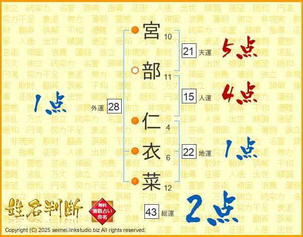 宮(10画)部(11画) 仁(4画)衣(6画)菜(12画)