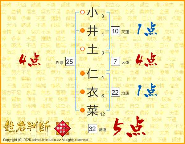 小(3画)井(4画)土(3画) 仁(4画)衣(6画)菜(12画)