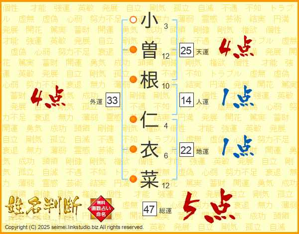 小(3画)曽(12画)根(10画) 仁(4画)衣(6画)菜(12画)