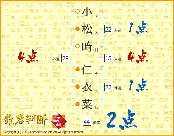 小(3画)松(8画)﨑(11画) 仁(4画)衣(6画)菜(12画)