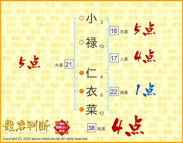 小(3画)禄(13画) 仁(4画)衣(6画)菜(12画)