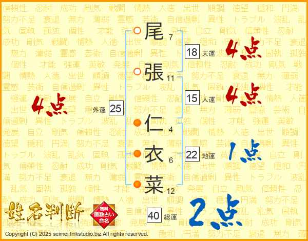 尾(7画)張(11画) 仁(4画)衣(6画)菜(12画)