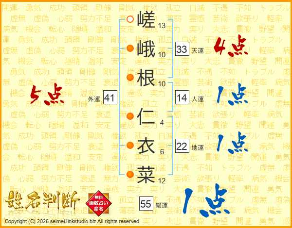 嵯峨根仁衣菜さんの総運は55画の1点!