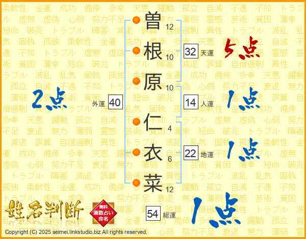 曽(12画)根(10画)原(10画) 仁(4画)衣(6画)菜(12画)