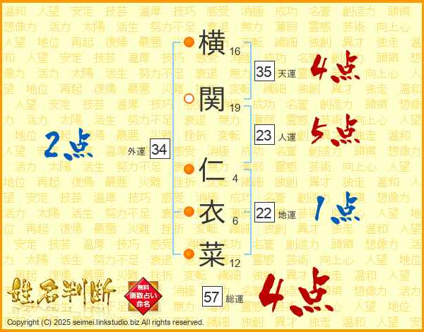 横(16画)関(19画) 仁(4画)衣(6画)菜(12画)
