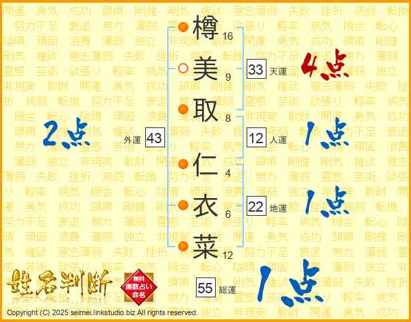 樽(16画)美(9画)取(8画) 仁(4画)衣(6画)菜(12画)