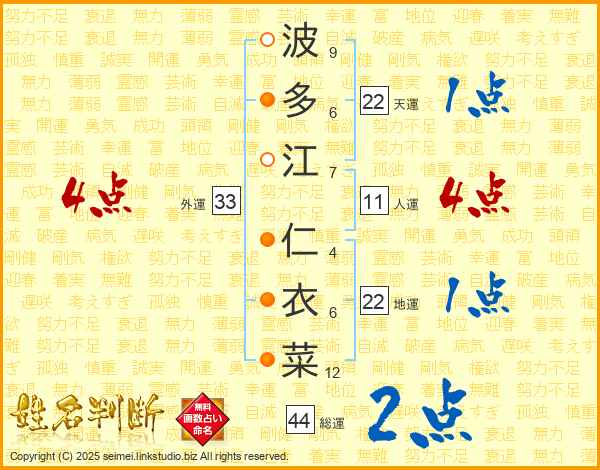 波(9画)多(6画)江(7画) 仁(4画)衣(6画)菜(12画)