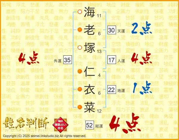 海(11画)老(6画)塚(13画) 仁(4画)衣(6画)菜(12画)