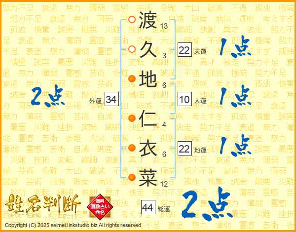 渡(13画)久(3画)地(6画) 仁(4画)衣(6画)菜(12画)
