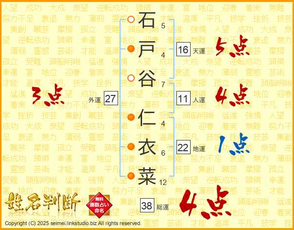 石(5画)戸(4画)谷(7画) 仁(4画)衣(6画)菜(12画)
